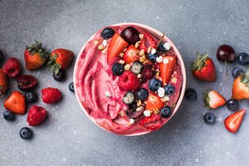 Acai sorbet, strawberries, blueberries, sliced bananas, granola, sliced almonds, and local Hackenberg honey. Add peanut butter sauce and/or chocolate chips for $2 more.